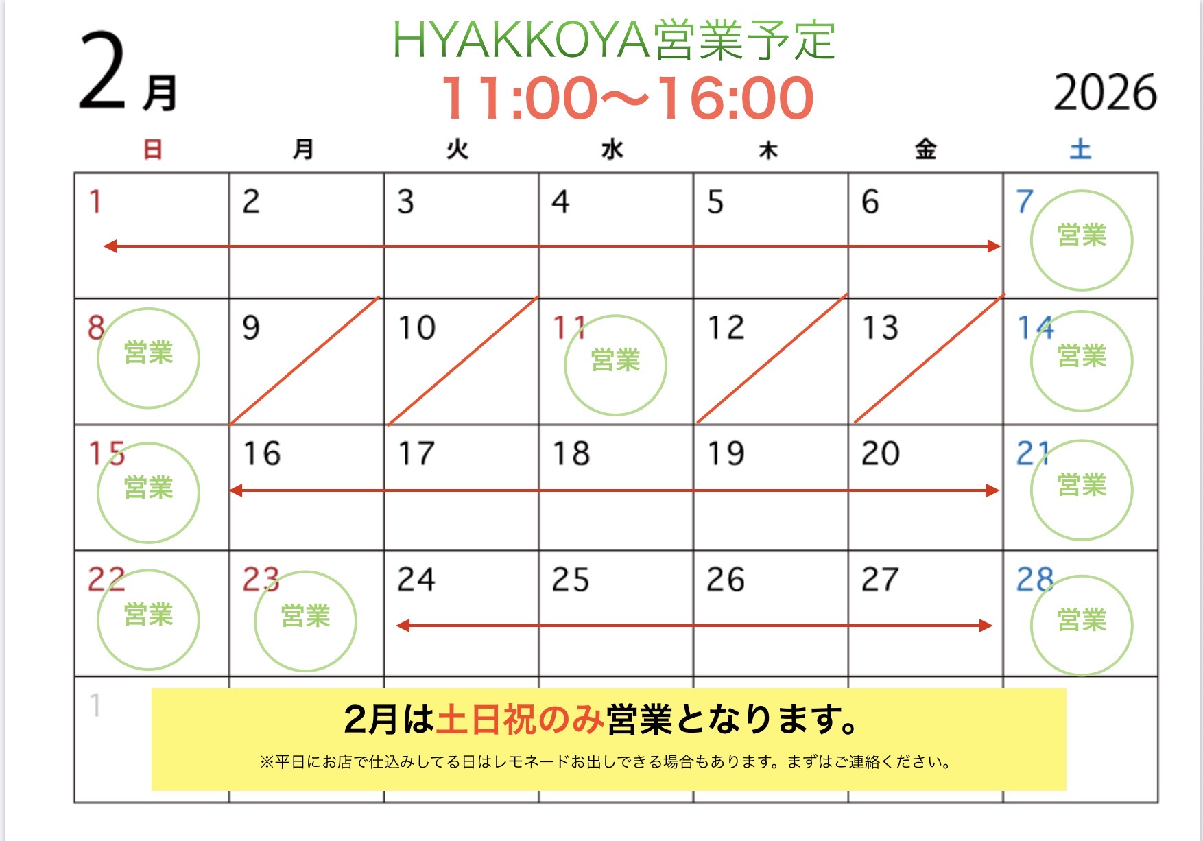2月営業日のお知らせ。