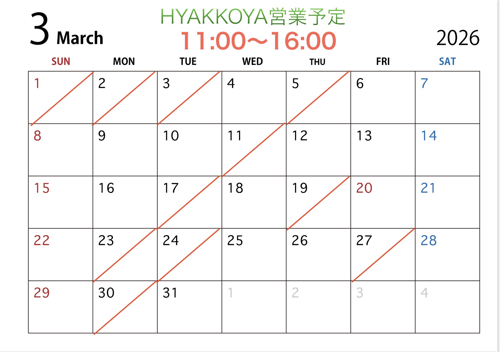 0845-25-6555 info@hyakkoya.com営業時間:11:00〜16:00(売切れ次第終了)