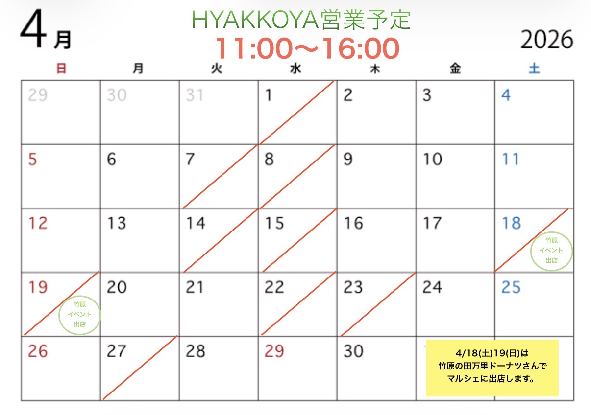 0845-25-6555 info@hyakkoya.com営業時間:11:00〜16:00(売切れ次第終了)